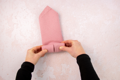 Drehe die Serviette, sodass die Spitze zu dir zeigt. Forme nun mit den Fingern das Herz leicht, bis die typische Herzform entsteht. Das heißt, du ziehst die oberen Bögen auf der linken und rechten Seite nach außen.