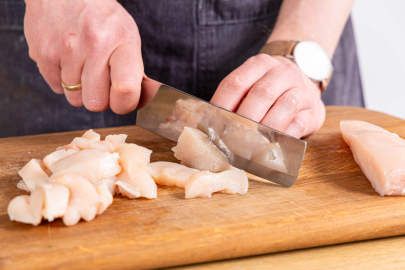 Damit das Hähnchen in der Wok-Pfanne saftig bleibt, solltest du es nicht zu lange braten. Kurz und heiß angebraten bleibt es innen zart und bekommt außen eine schöne Farbe.