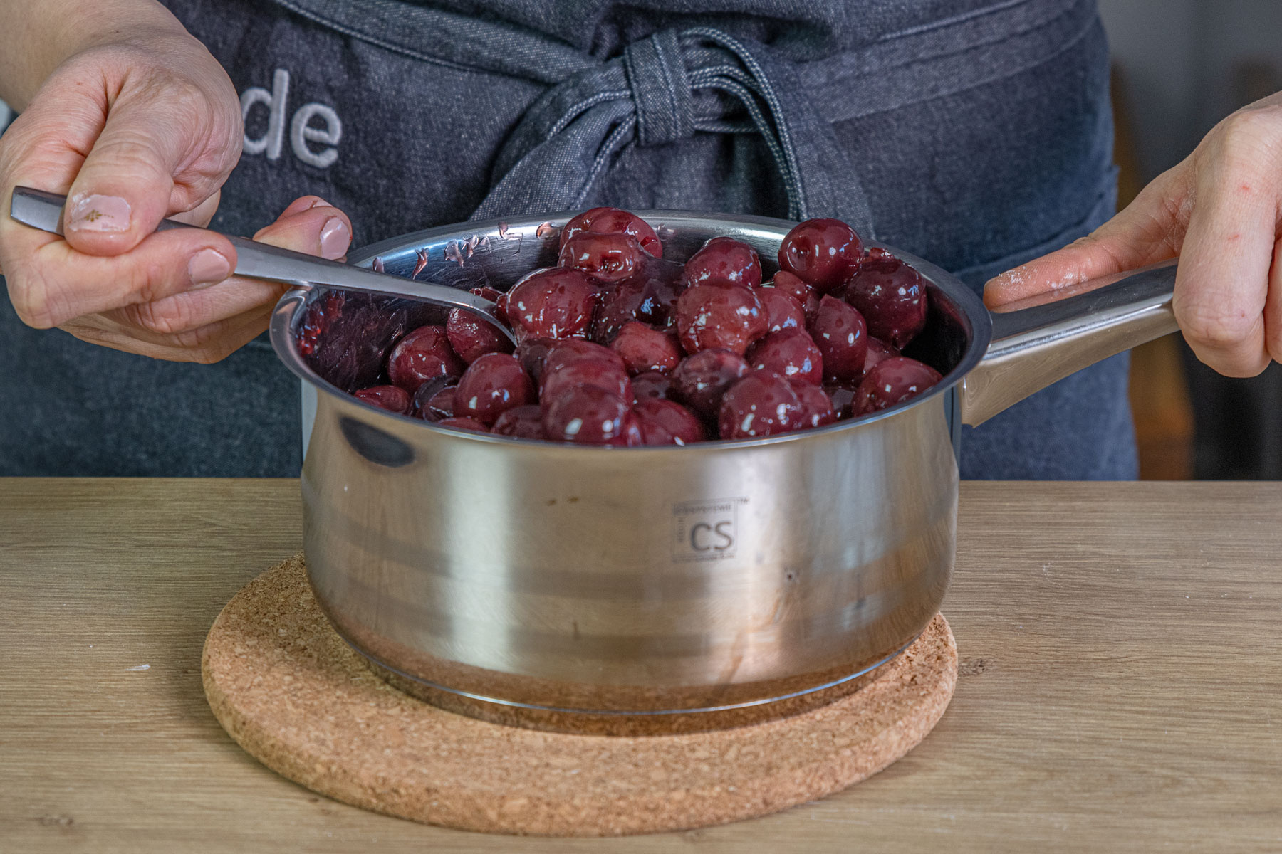 Den Pudding etwas abkühlen lassen und danach die Kirschen einrühren.