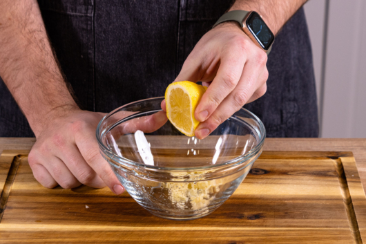 Danach den Knoblauch schälen und pressen. Zitronensaft dazugeben und das Ganze dann mit der geschmolzenen Butter verrühren.