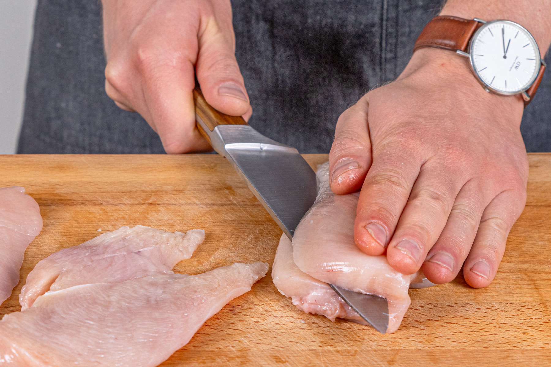 Die Hähnchenbrust abtupfen, waagerecht halbieren und in eine Auflaufform legen.