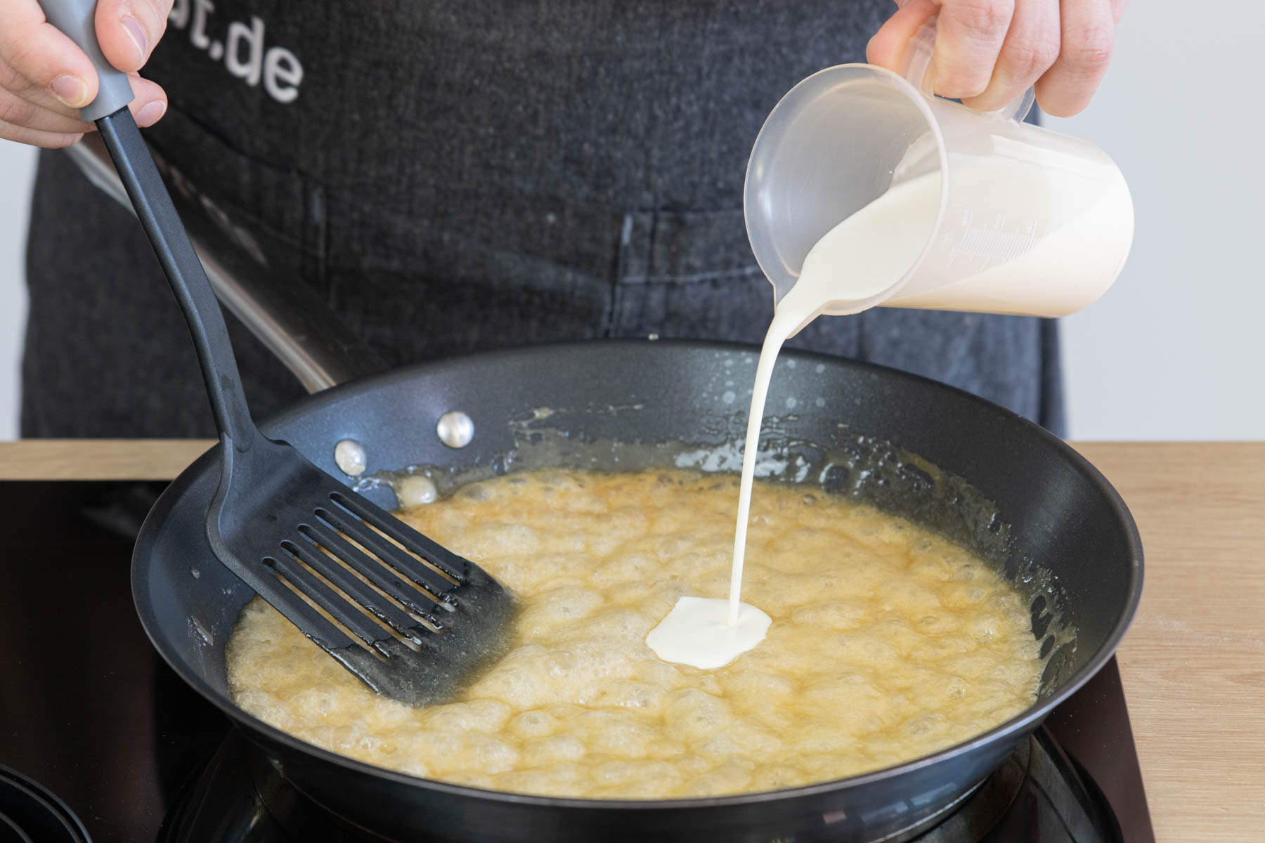 Die Sahne dazugeben und aufkochen lassen. Hier muss mit einem Zuckerthermometer ganz genau auf die Temperatur geachtet werden. Die Masse wird so lange unter ständigem Rühren gekocht bis ihre Temperatur mindestens 130°C bis höchstens 150°C erreicht hat.