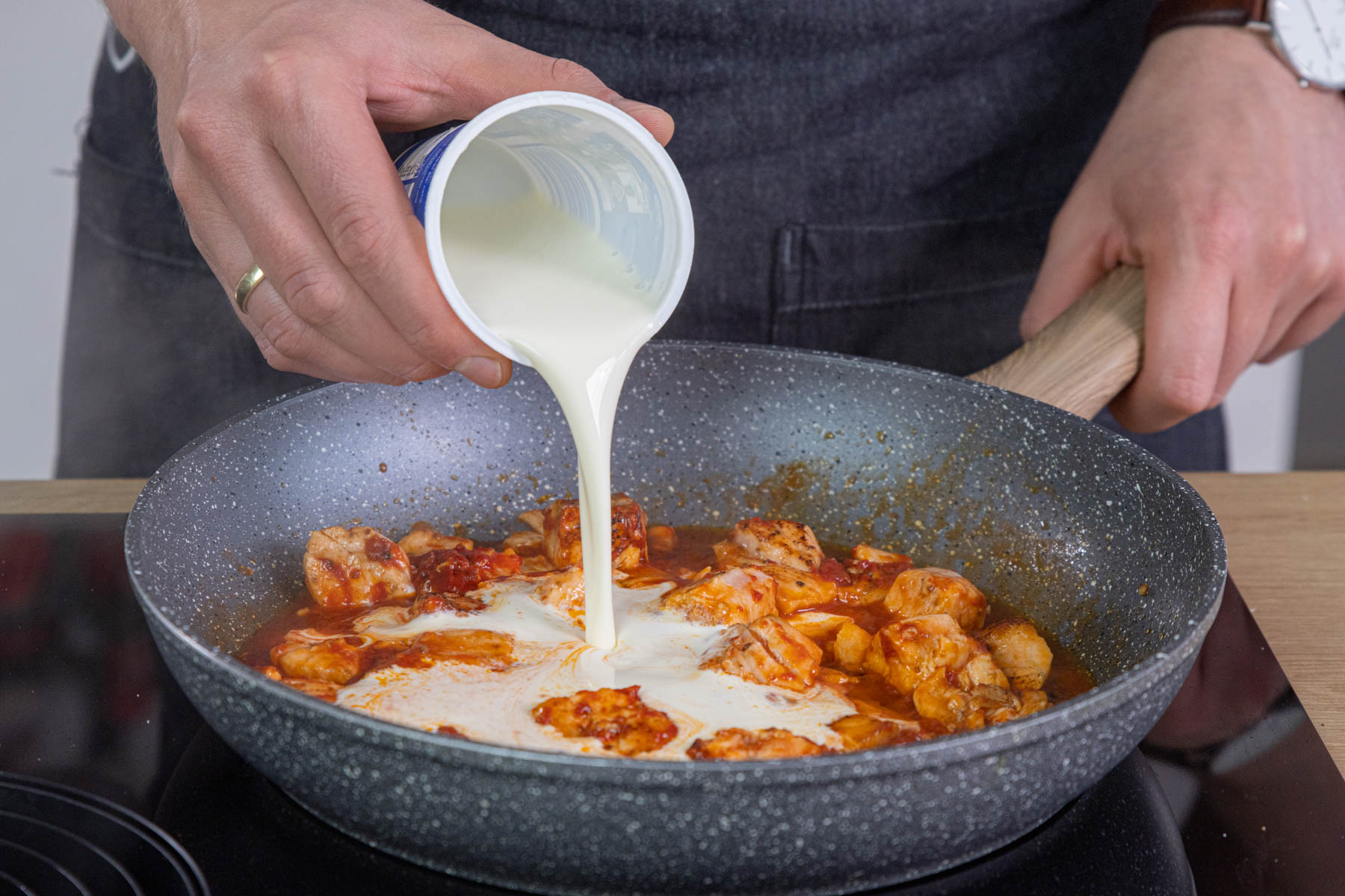 Sahne dazu gießen und alles einmal aufkochen.