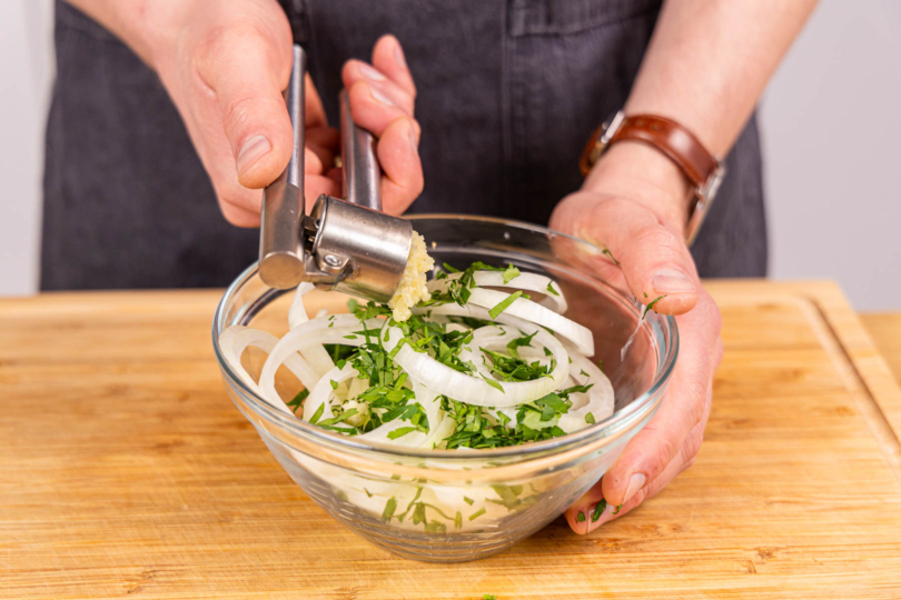 Zwiebel schälen und in dünne Scheiben schneiden. Knoblauch fein hacken oder pressen. Petersilie waschen, trocken schütteln und fein hacken. Alles in einer Schüssel mischen