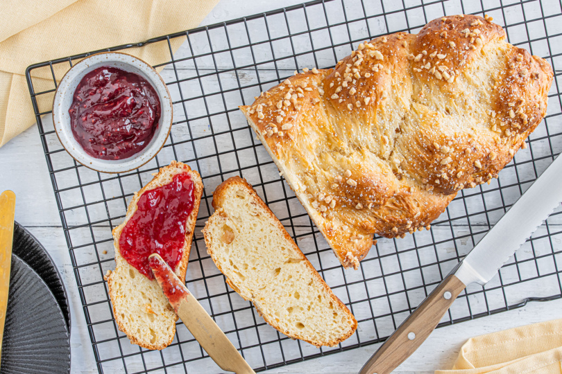 Wir finden so ein Osterzopf schmeckt am besten, wenn du dir eine Scheibe abschneidest und mit selbstgemachter Marmelade bestreichst. Lass uns in den Kommentaren gern wissen, welche deine Lieblingssorte ist.