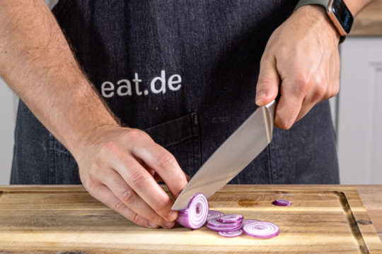 Nun den Belag vorbereiten. Zucchini und Paprikas waschen, Zwiebel schälen und alles in Ringe schneiden.