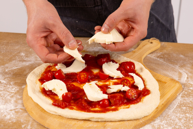 Drücke jede Kugel mit den Fingerspitzen von der Mitte aus flach nach außen und arbeite dich so langsam vor, bis deine Pizza genauso groß und flach ist wie du möchtest. So entsteht ein gleichmäßiger, dünner Boden mit einem leicht erhöhten Rand. Wir raten davon ab, ein Nudelholz zum Ausrollen zu verwenden, da es den Teig zu sehr zusammenpresst und die Pizza Caprese wird später nicht so fluffig. Wenn du bereits etwas geübter bist, kannst du den Teig auch „auseinanderziehen“, das ist am schonendsten.