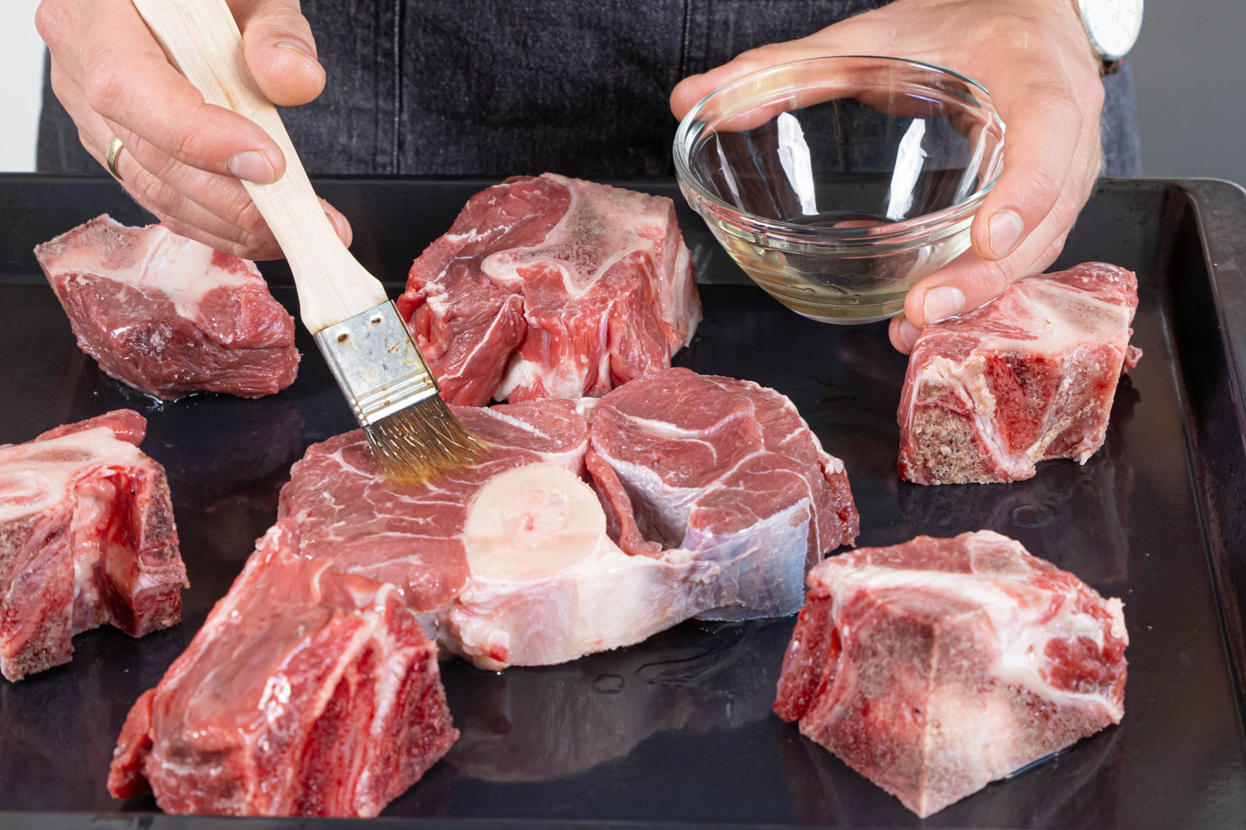 Backofen auf 220 °C Umluft vorheizen. Rinderknochen und Beinscheiben mit kaltem Wasser abspülen, trocken tupfen und auf ein Backblech legen. Anschließend mit Öl einstreichen und für 45-60 Minuten im Ofen rösten.