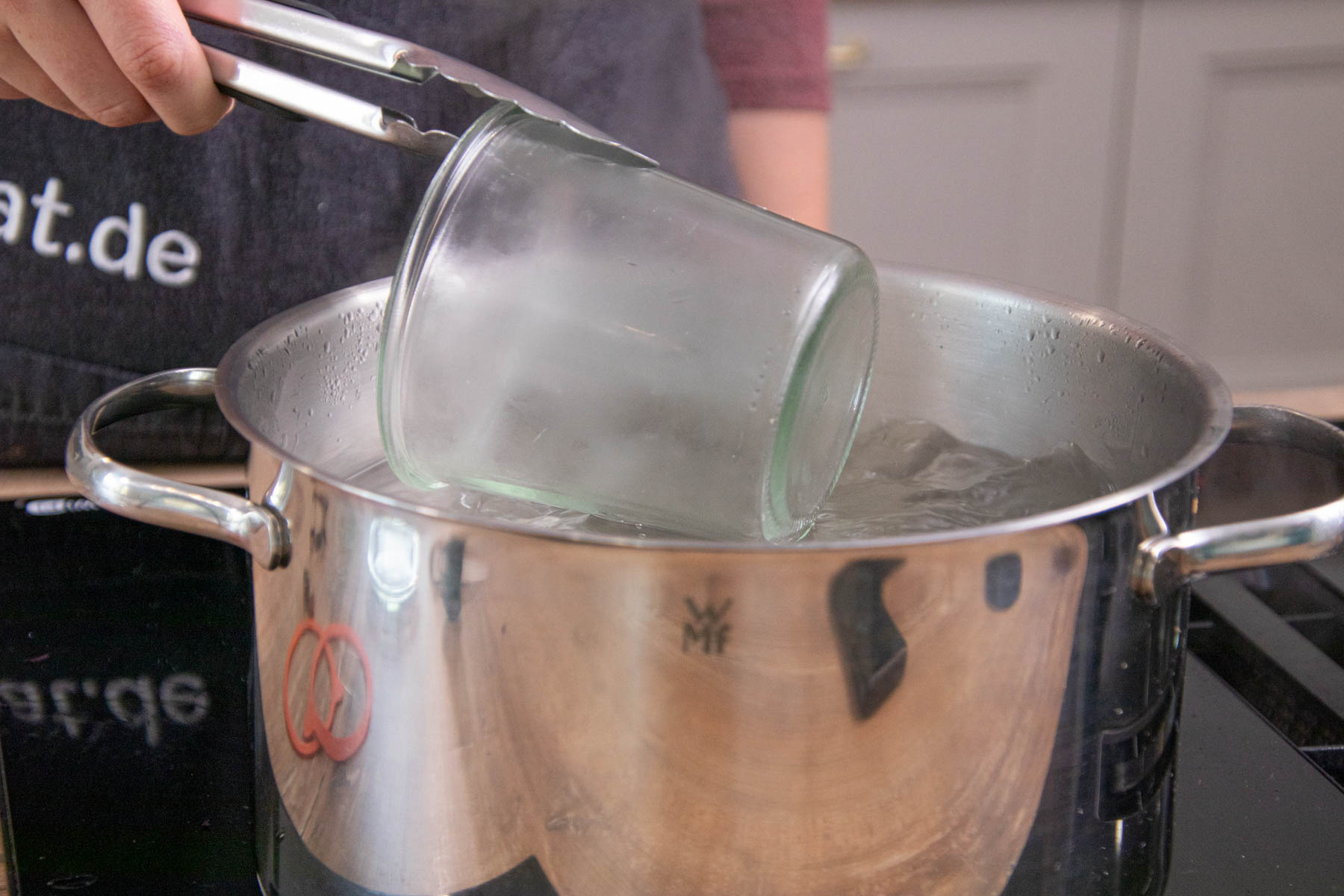 Nun die Einmachgläser etwa 10 Minuten in kochendem Wasser sterilisieren. Danach auf einem sauberen Küchentuch abtropfen lassen.
