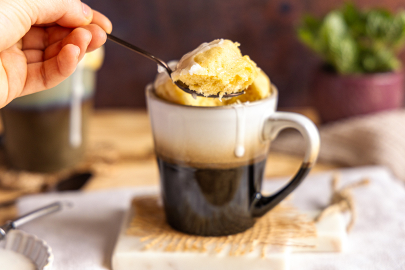 Den Tassenkuchen kannst du prinzipiell in jeder Tasse zubereiten. Bei einer kleineren Tasse solltest du dann die Garzeit etwas anpassen und immer mit einem Holzstäbchen prüfen, ob der Kuchen durchgebacken ist.