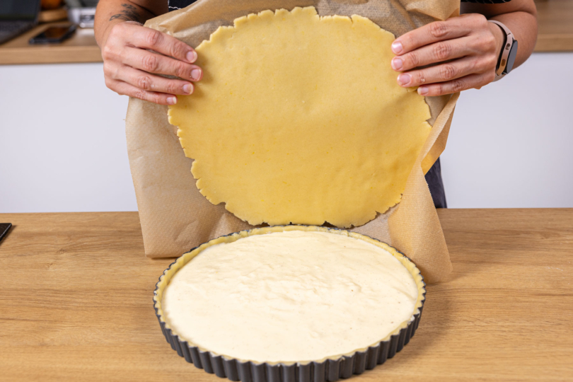 Dann den übrigen Teig erneut auf dem Backpapier auf Backform-Größe ausrollen und die Tarte damit abdecken. Die Ränder vorsichtig rundherum andrücken.