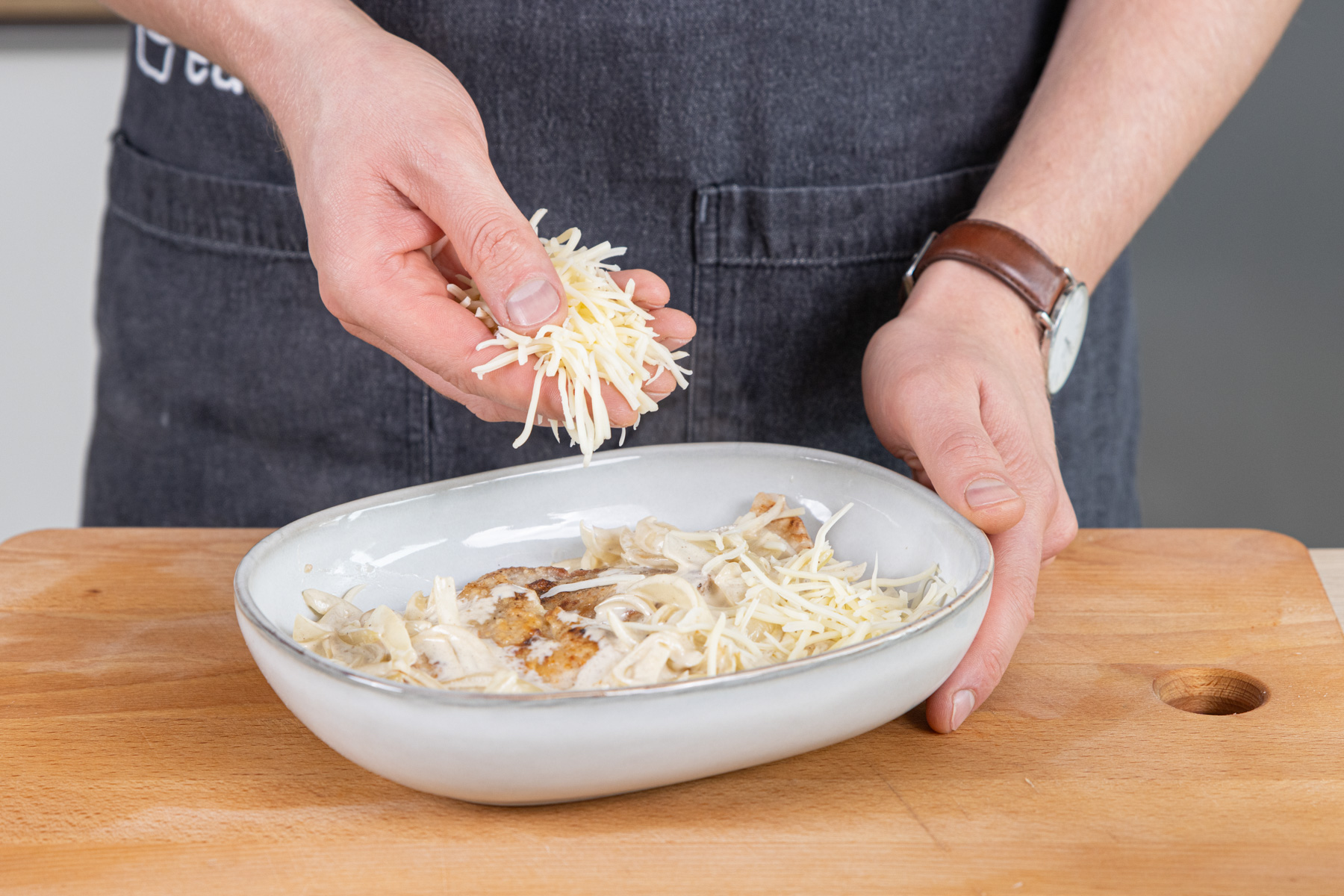 Ofen auf 180 °C Ober-/Unterhitze vorheizen. Sahne- Zwiebel-Sauce über die Schnitzel geben und mit geriebenem Käse bestreuen. Anschließend im Ofen für ca. 30 bis 35 Minuten überbacken.
